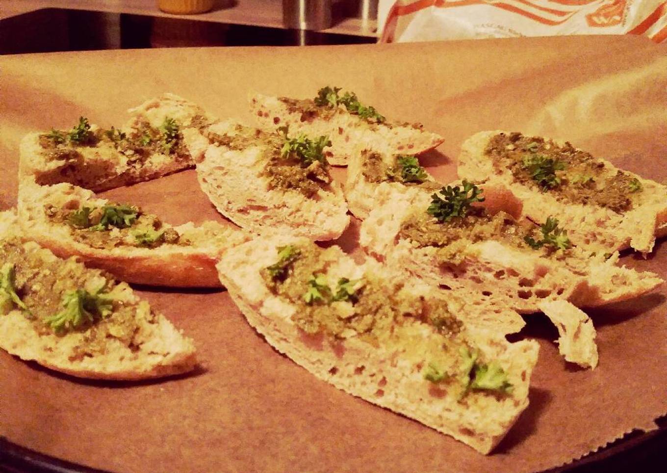 - Spread already prepared pesto on top. Make sure it's well spread so the bread doesn't dry out too mich