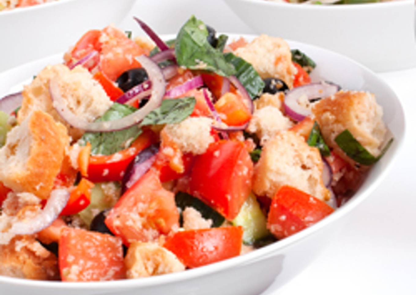 A refreshing salad: Tomatoes, onions, cucumber and bread cubes are seasoned with basil balsamic dressing.