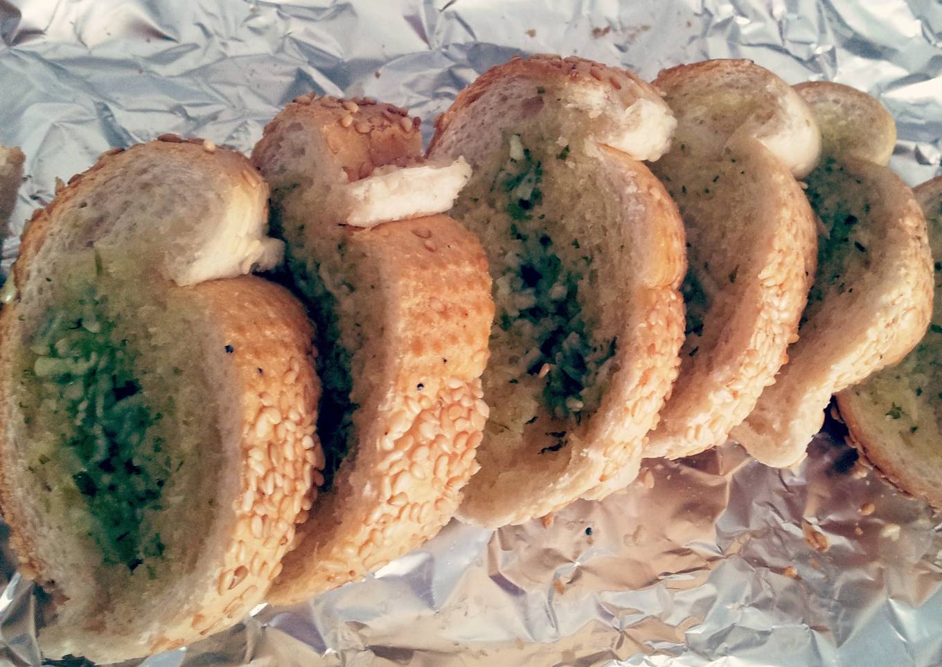 - Spread on both sides of each slice and place them on aluminum foil to create the baguette shape.