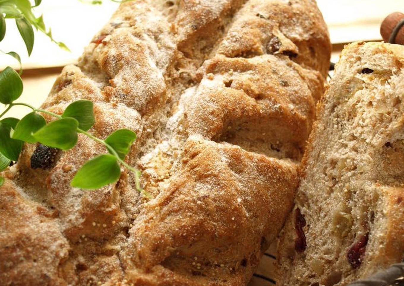 The best way to slash the top of the loaf is to mist the top, dust with joshinko rice flour, and then do it in one go using a cheap razorblade. The raisins and walnuts are a must, but otherwise add whatever dried fruits you want. I added all kinds of dried fruits that I'd bought to use in baking and were left over. Recipe by Pokuchan